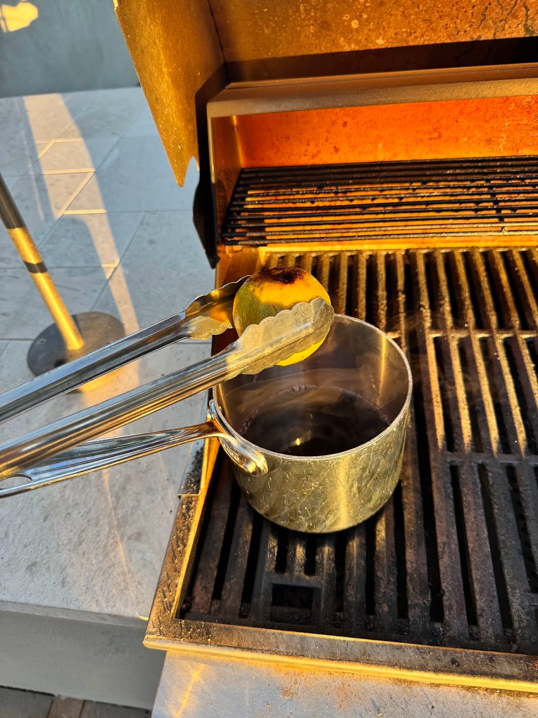 We’ve been over this already. I brought it to a boil in a pan and killed the heat, then brought it out to the grill with the flambeed orange.