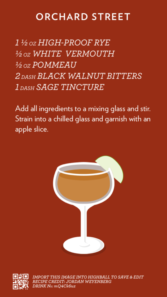 A great way to easily incorporate some apple flavor into a cocktail is to replace the fortified wine you would be using with Pommeau. Alternatively, turn up the booze and replace any liqueur with the same. I love how apple pairs with a strong rye whiskey, so I did this with a Brooklyn, removing the Maraschino to create the Orchard Street. I also threw in a few additional dashes of bitters: Fee Brothers Black Walnut and Addition Sage to increase the spice and nut profiles in the drink.