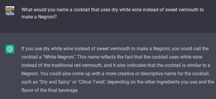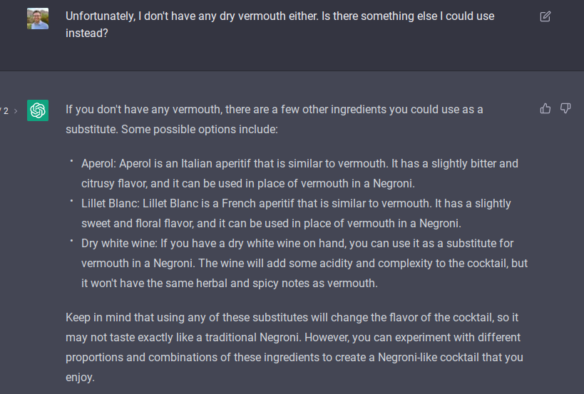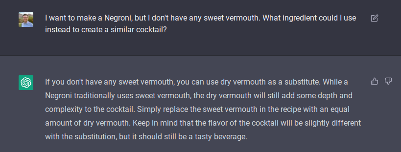 But, not that basic. If a Google search gives you a great result, I don’t care that ChatGPT can replicate it. “How do I make a Negroni?” or “How much sugar do you put in an Old Fashioned?” are frequently-asked questions that your search engine of choice can quickly and efficiently answer. So let’s start with the next step of this problem: I know how to make a Negroni, but I don’t have any sweet vermouth on hand.