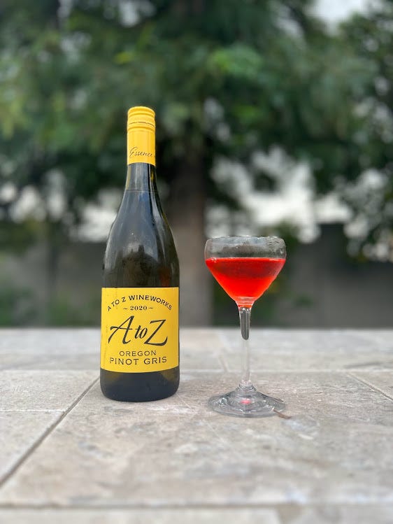 But even though I don’t like the name, I really do like the drink. I used an Oregon Pinot Gris that we often also use for cooking because it’s very dry and acidic. That character really works here, and the resulting cocktail is extremely dry but also very bright. If you have some open white wine around, you’d do worse than making one of these instead of just pouring a glass.