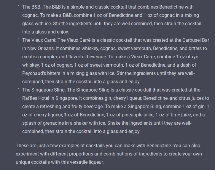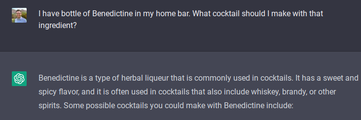We’ve confirmed (in at least one case) that ChatGPT can recommend a solid substitution for a well-known cocktail, but how will it handle starting with less constraint? Let’s say you’re following my Cocktails of the Month and you now have a bottle of Benedictine in your home bar; what do you want to do with it? What would ChatGPT do?