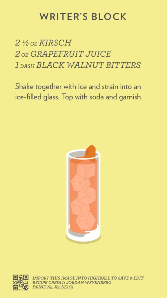 The Writer's Block is my own creation, inspired by the Farewell to Hemingway. I'm overrun with amazing local grapefruit at the moment, and I was intrigued by the flavor combination of a sweeter citrus here. I added the nut bitters to help amplify that part of the kirsch. I prefer this to the original because it's softer without lime juice. It also has almost no nose, and I didn't think killing the ethers from the kirsch was even possible. The flavors meld well, and the result is a daisy cocktail that delivers a deep nuttiness alongside strong citrus high notes.