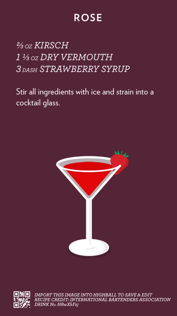 For a spirit with such a long history that has found its way into so many homes over that period, there are shockingly few "famous" recipes that include kirsch. There's only one true classic (the Rose) that I dive into below, and the closest-second is the Farewell to Hemingway (which inspired my own creation below). It can't substitute for anything else directly and be successful, and it requires a delicate touch.