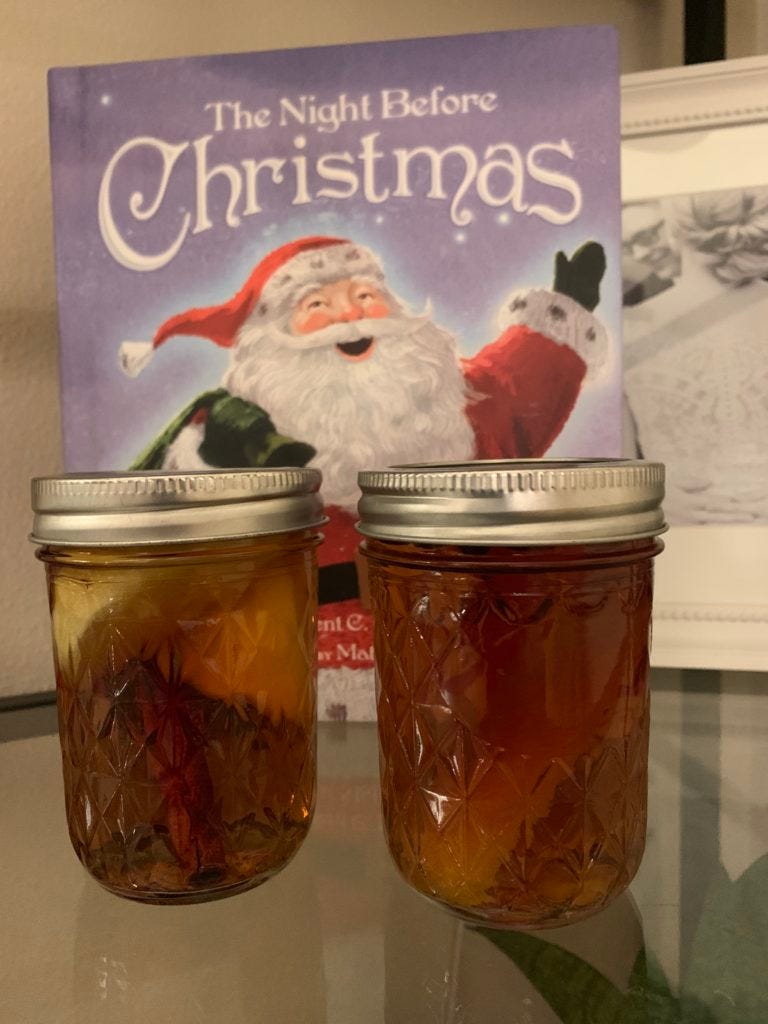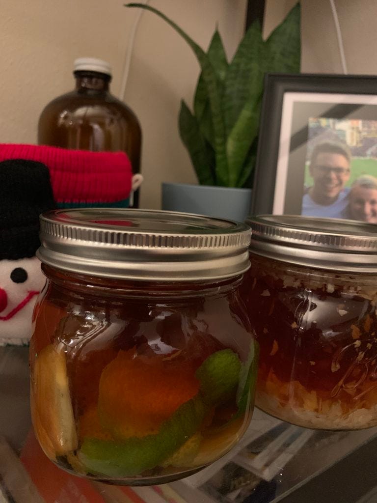 Then, riff on those! Put some peeled apple slices in with the cinnamon whiskey and some citrus peel into the coconut rum. Add some ginger to both for a bit of different spice.