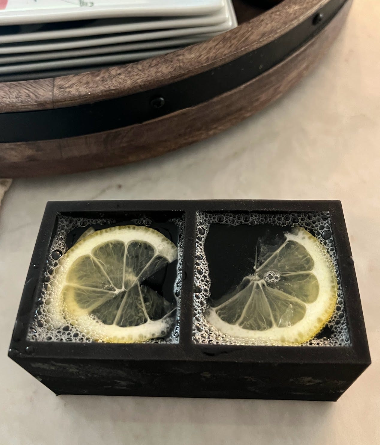 Making infused ice can be tricky, but this one seems to be quite forgiving. In a large mold (believe this one is 1.5 x 1.5) I added a few very thin lemon slices, and then replaced about 20% of the water with lemon juice.