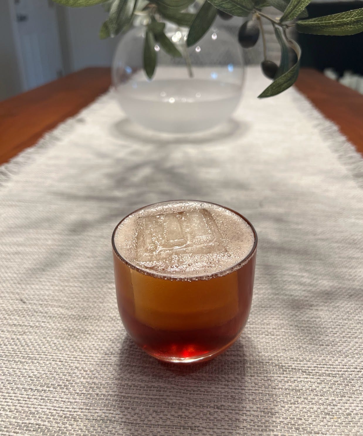 But, since cremes can be quite cloying, I also wanted a way to combat that. The bitter helps, but the best balance for sweet is always sour. So, I also added a (branded!) ice cube infused with lemon that adds some sourness as the drink sits and you sip it. The result is a drink that changes over time and goes from a bit too sweet to a bit too sour, with a perfect zone in the middle, which I think is kinda fun.