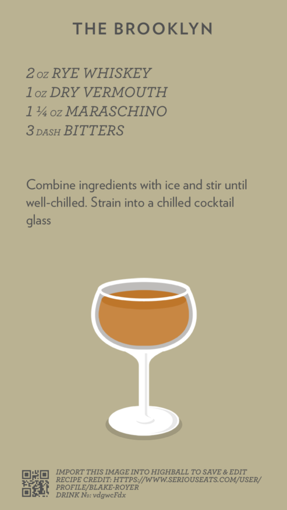 The Manhattan is one of the more riff-able cocktails, and the Brooklyn may be my favorite riff. It take the Perfect Manhattan idea, but it replaces the sweet vermouth with maraschino, a cherry liqueur.