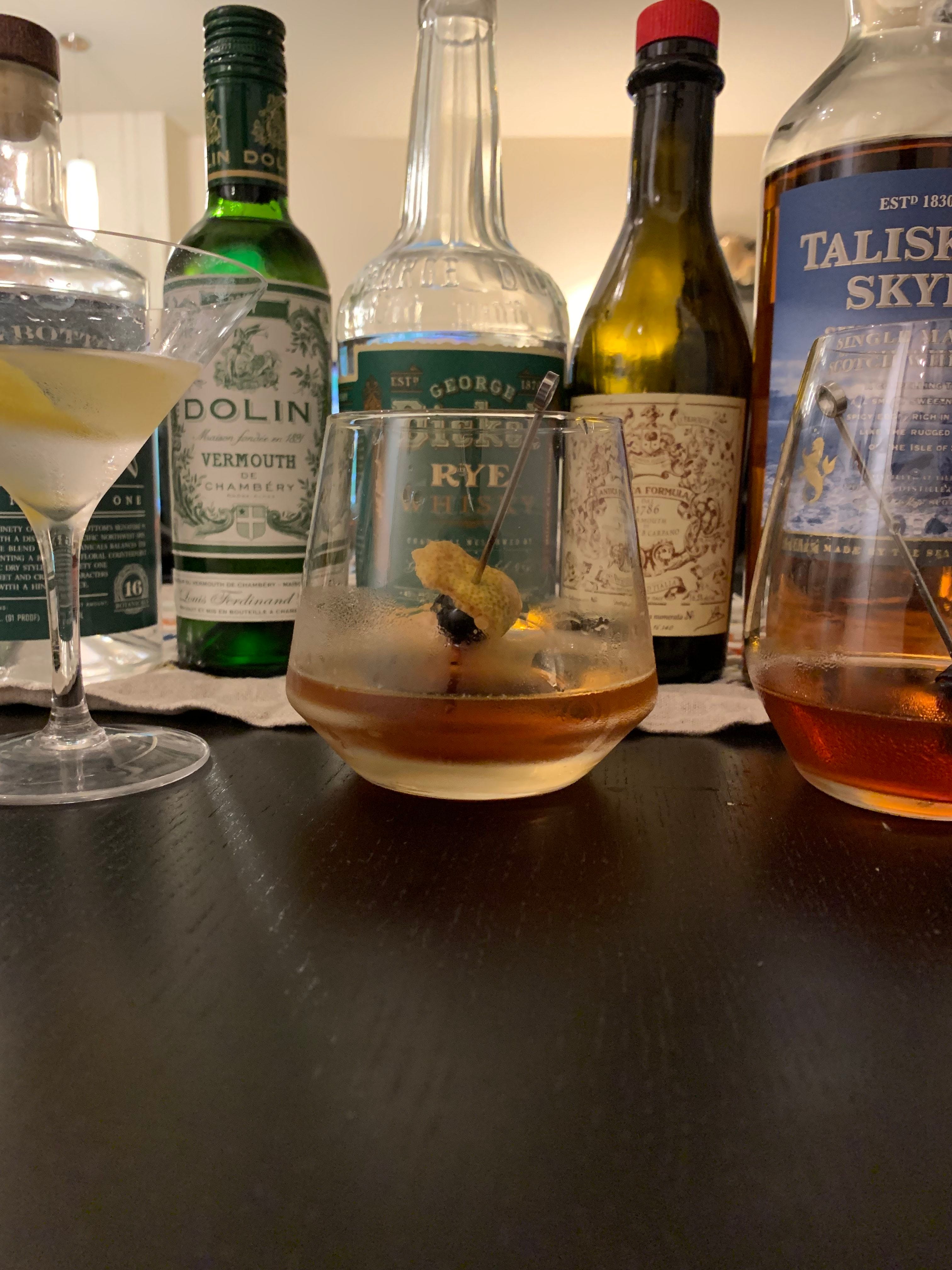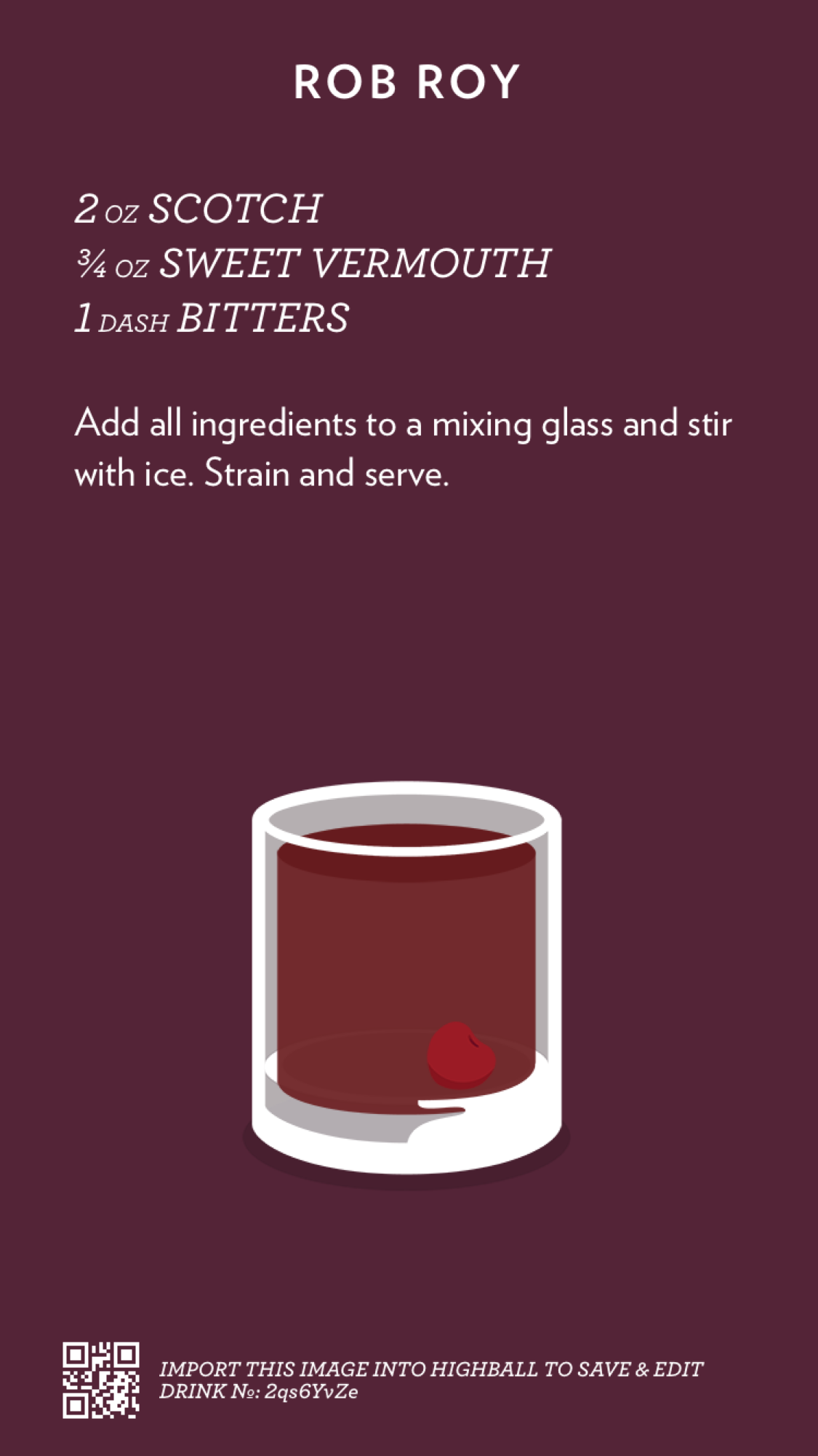 A sweet and smokey variation on the classic Manhattan. The nose of the scotch overpowers the vermouth, but then on the palate the smoothness of the vermouth takes over and mellows the smoke.