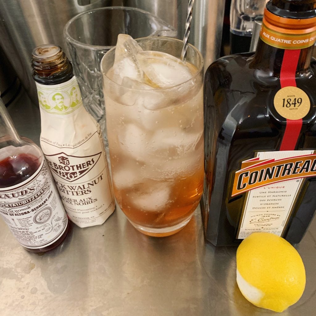 I take about a quarter-ounce of Cointreau and add it to a glass filled with ice. Then, I take a few different bitters and give several good dashes of each. I fill with sparkling water (Perrier is probably my favorite for drinks) and give it a stir. Then, peel some citrus and express it over the drink. It’s extremely low-ABV but still flavorful and interesting! It's also endlessly-riffable, so put your own spin on it.